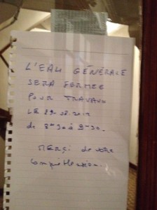 Alright, it didn’t go quite that smoothly. Since it was already 6:30, the building management, or Syndic, was gone for the day, so I spent a sleepless night mopping the bathroom floor. Tuesday morning my neighbor came over and started calling the Syndic until she got someone. “Mademoiselle is leaving for New York tomorrow so this is very urgent,” she told the woman who finally answered the phone. “C’est pas ma problème,” I heard the woman reply—it’s not my problem. Tant pis. Plumbers would be hard to find in August. But after several calls, find one they did, and a Monsieur Petite arrived 5 hours later to survey the problem. Hallelujah.