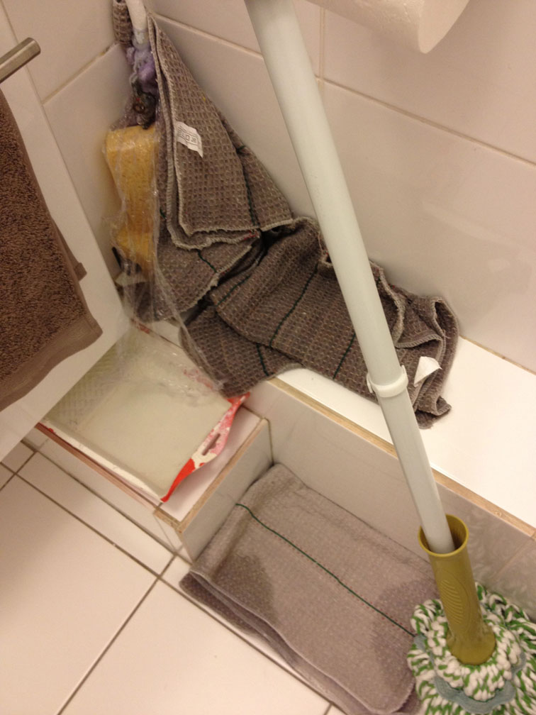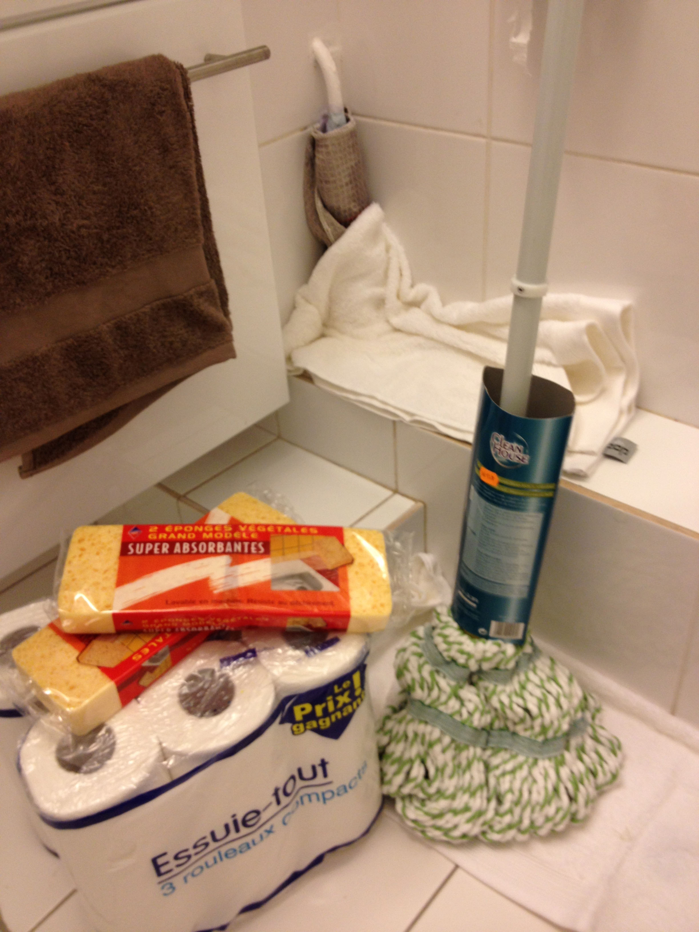 By the time I arrived home, my entire bathroom floor was under water, my wood flooring within inches of watery doom. The only handy solution: my brand new Egyptian cotton towels from Habitat, but there was no time to think about that. I wiped up the floor then dashed down the street to Franprix to buy anything absorbent I could carry—a mop, two 3-packs of paper towels and eight giant sponges—which, owing to the store being out of large shopping bags, had to be carried in my bare hands. This amused a guy sitting at the cafe on my corner who chuckled at my misfortune from behind his beer. “Fuite?” he asked, smirking. Yeah, very funny, asshole. But at least now I knew the word for it. Leak: la fuite.