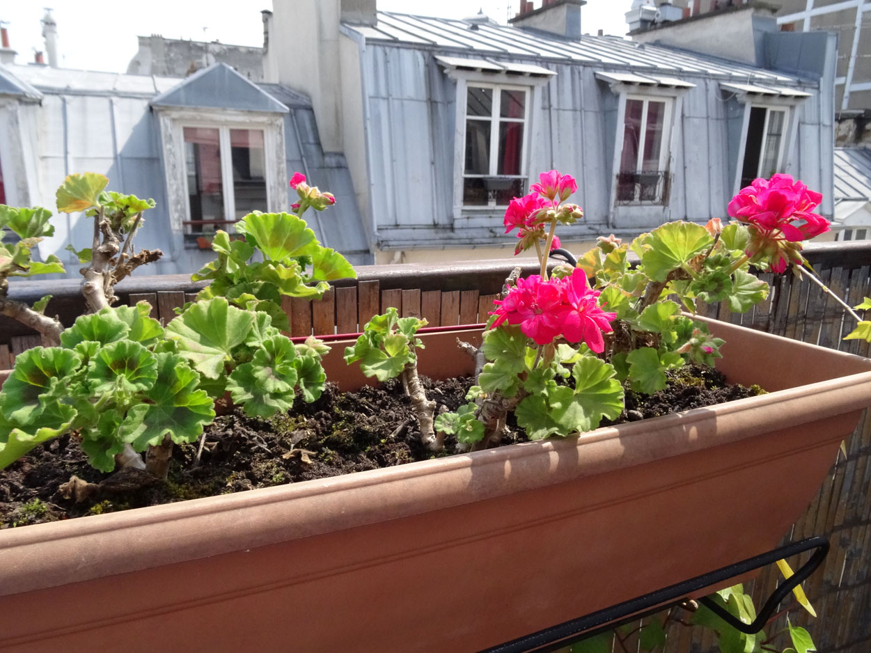 The first of my three rental apartments in Paris came with a terrace fitted with three window boxes of geraniums. At least they resembled geraniums. Something like geraniums poked out from dirt so hard you’d break a nail if you dug your finger into it. Yellow leaves clung to dry, hard branches, and withered petals hinted at flowers. They needed love.