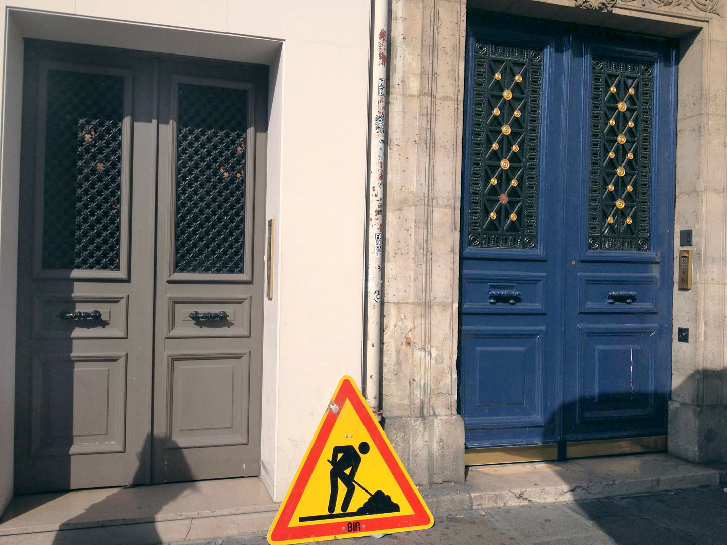 Greige and blue duke it out side-by-side on Rue Rambuteau. ©Lisa Anselmo