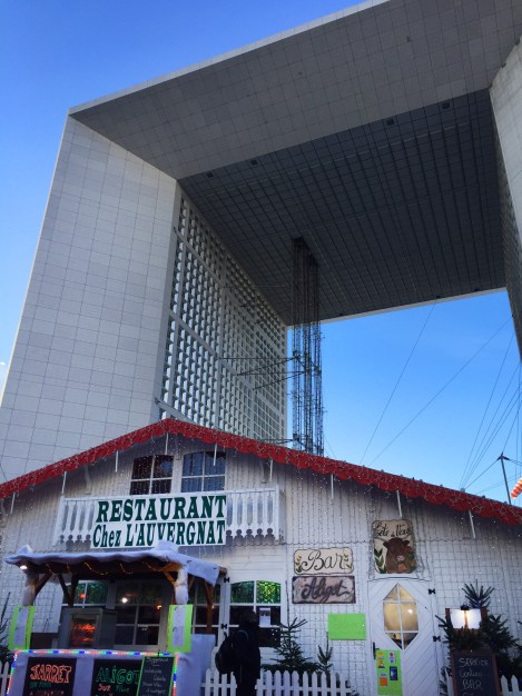 The restaurant of the Christmas market dwarfed by La Grande Arche at La Défense.