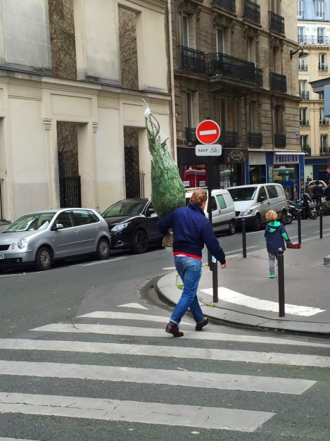 Father and son, walking home with their Christmas tree, 11th arrondissement.