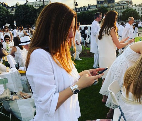 On my phone posting to social media during Dîner en Blanc. I have crappy réseau.