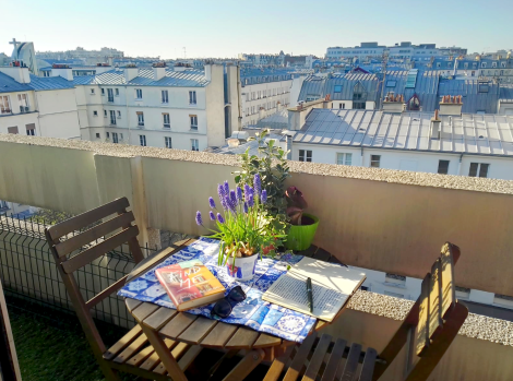 If you’ve read my book, you know this view. This terrace, high up in a large apartment complex, belongs to my friend Fabien. I describe it, and the view, in Chapter 12, page 138 (print). To have a large terrace is a huge gift, and very rare. I’m not a little jealous. Outdoor space makes all the difference when you are confined. If you lean out, and look to the left, you can even see the Eiffel Tower. I hope I can have dinner with my friend on this terrace soon again.