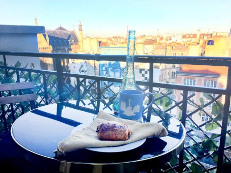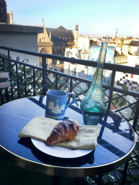 My dear friend, Andrew, has a beautifully decorated terrace in the Marais, with an enviable view of Paris and the Eiffel Tower in the distance. Andrew is a wonderful host, and I’ve spent a lot of time on this terrace over the years. Andrew sends me photos of his breakfast every morning, his provisional café chez lui. Below, a photo from 2017, drinking spritzes as the sun sets.
