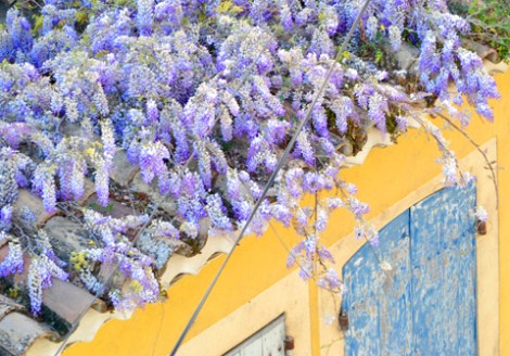The wisteria running rampant on a nearby roof.