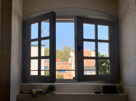 Welcome to Nîmes in the south of France, where friend Patty is confined in her lovely apartment housed in a former convent dating from 1740—an elegant fortress made of thick stone walls, with high beamed ceilings and a large courtyard garden. It’s a haven against the big, bad world.