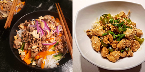 Friend Edward is at it again. On the left, what he calls “Asiany Rice Noodles,” and his sesame chicken, right. Just a little something he tossed together. Below, another friend took us to Mexico with her brunchy migas.