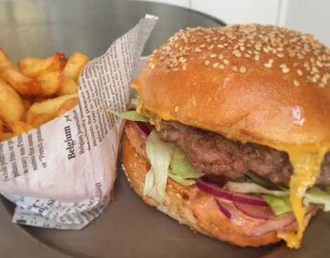 Le burger from Le Pure Café takeaway. The fries stayed crispy despite the 10-minute walk home. And they gave me a Chupa-Chup lollypop! (Apologies to my vegetarian friends.) ©Lisa Anselmo