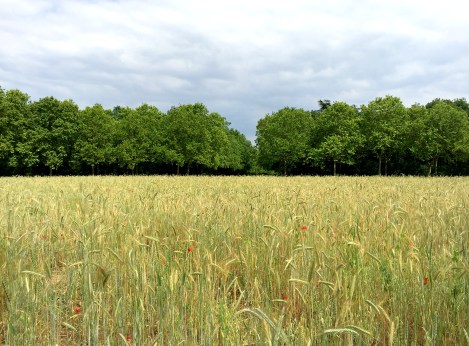 We walked through the woods for quite a while then came to a clearing, wheat and poppies as far as the eye could see, and grassy fields, perfect for picnicking. On either side of the fields, paths lined with tall trees whose branches bowed overhead, like the ceiling of a cathedral.